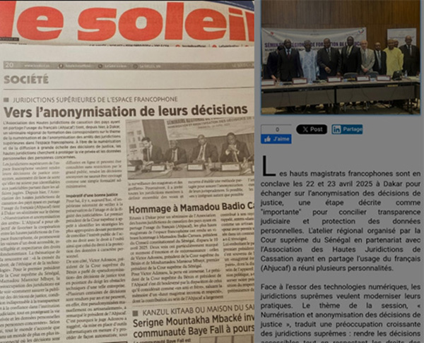 Les représentants de 15 Cours africaines et la Cour de cassation française ont pu échanger à Dakar sur les processus de numérisation et d’anonymisation des arrêts, à partir de décisions récentes importantes qu’il avait été demandé à chaque Cour de mettre en évidence. Ces arrêts sont intégrés dans la base de jurisprudence francophone JURICAF et regroupés sur la page dédiée du site de l'AHJUCAF dans la rubrique "sélection d'arrêts".