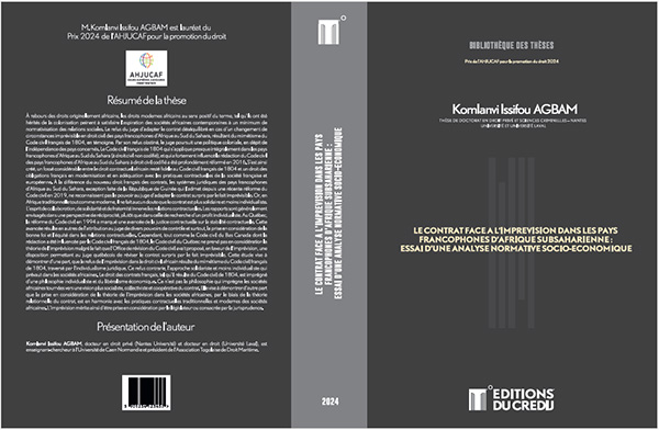 M. Komlanvi Issifou Agbam a été lauréat du Prix de l'AHJUCAF 2024 pour sa thèse : "Le Contrat face à l'imprévision dans les pays francophones d'Afrique subsaharienne : essai d'une analyse normative socio-économique " réalisée sous la codirection de MM. les professeurs Charles-Edourd Bucher , Reza Moradinejad et Kuassi Deckon, soutenue à l'Université de Laval (Canada - Québec) le 15 décembre 2023.